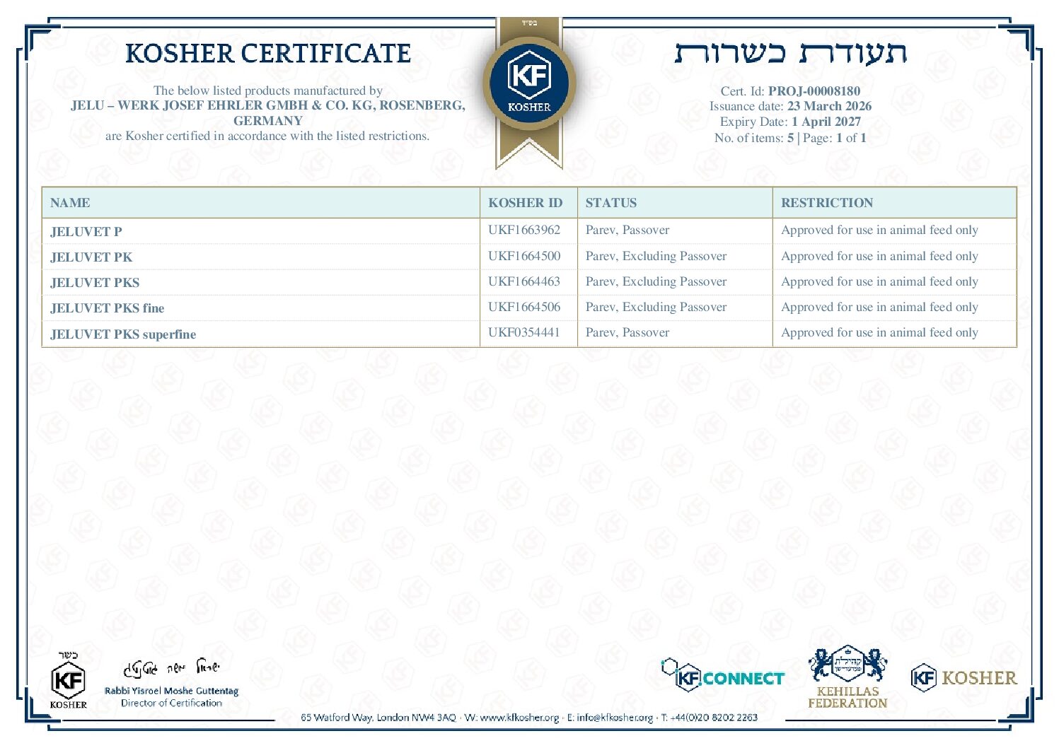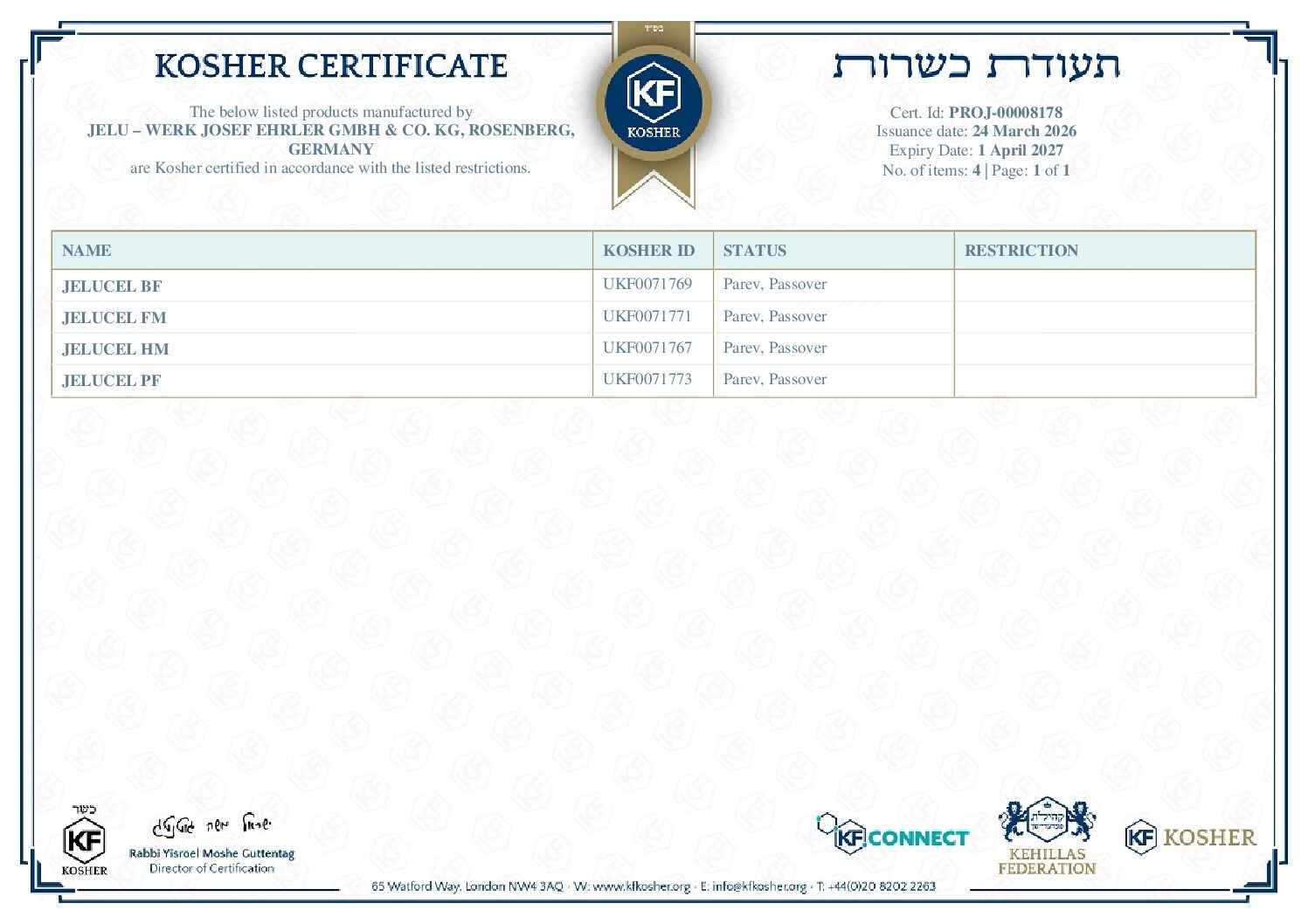 Kosher Certificate(PF, BF, HM, FM) valid until 1. April 2027