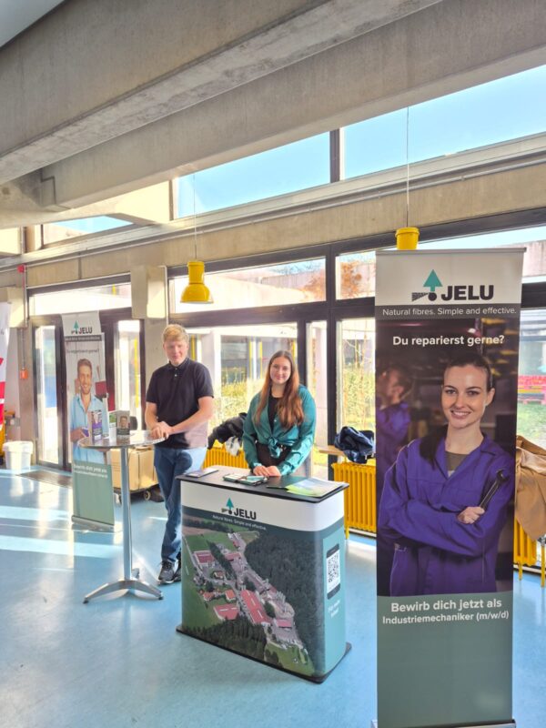 Unsere aktuelle Auszubildende Cristine (2. Lehrjahr) und unser Produktionsleiter aus der Eigentümerfamilie, Jonas Stirner waren auf der Ausbildungsmesse vertreten und standen interessierten Schülerinnen und Schülern sowie deren Eltern für Fragen rund um die Ausbildungsberufe und das Unternehmen zur Verfügung. Es wurden Tipps weitergegeben, Praktika vereinbart und aus dem Nähkästchen geplaudert, wie es ist, ein Azubi bei JELU zu sein.